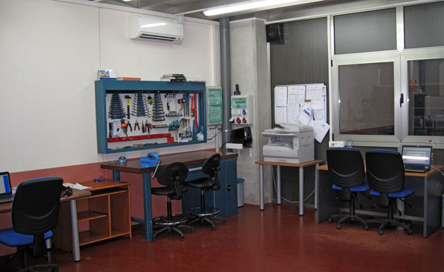 En el taller-laboratorio se revisan los equipos de medición, inyección, etc. para que estén siempre en un óptimo estado para su uso. Este espacio está dedicado también para el estudio y prueba de nuevos sistemas de protección así como para organización y almacenaje de herramientas, equipos de medida, equipos de inyección, etc. En el almacén se acopian diversos materiales, útiles, herramientas, material de seguridad, etc.